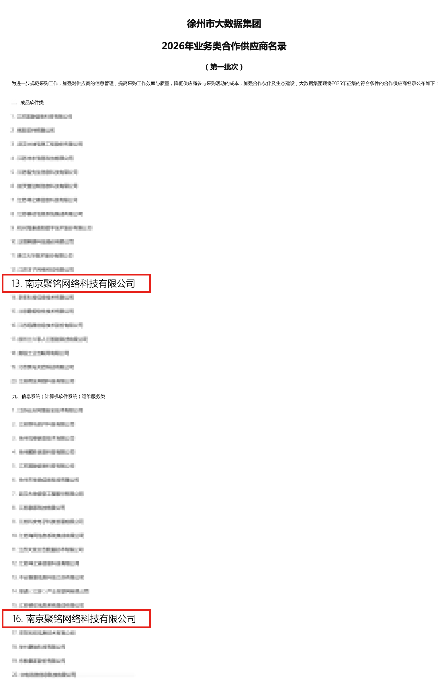 近期,徐州市大数据集团正式公布《2026年业务类合作供应商名录(第一批次)》。凭借在网络安全领域深厚的技术积淀、完善的产品体系及卓越的服务能力,聚铭网络从众多参选企业中脱颖而出,成功入...