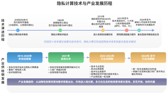 隐私计算历经四十余年的发展,依次经历了“理论奠基—技术成熟—进入商用—产业洗牌”四个重要阶段,可以说已圆满完成了初始阶段的发展任务。目前,在国家“十五五”规划中,“人工智能+”核心战略与数据局统筹的可信数据空间落地政策的积极推动下,隐私计算即将迈入“政策驱动—场景落地—产业重塑”的崭新阶段。