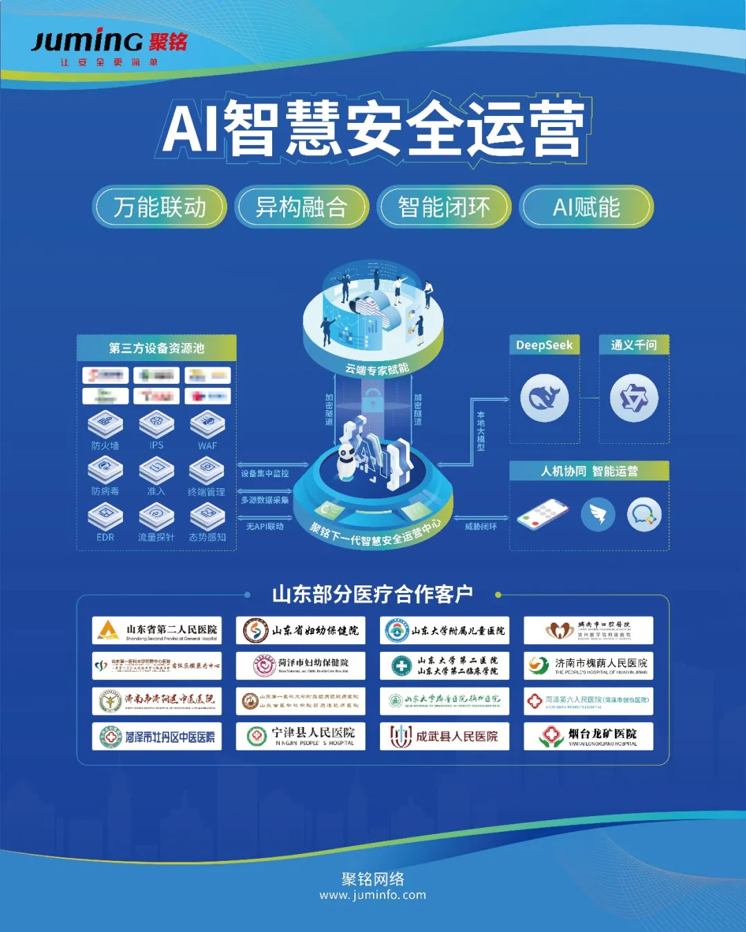 医疗网络安全关乎患者生命安全与公共卫生体系的稳定运行。在数字化转型浪潮中,聚铭网络将持续深耕医疗安全场景,以异构融合为技术底座、以AI研判为智慧引擎,助力医疗机构构建高效、协同、可持续的安全运营体系,为新时代医疗网络安全新生态建设贡献专业力量。